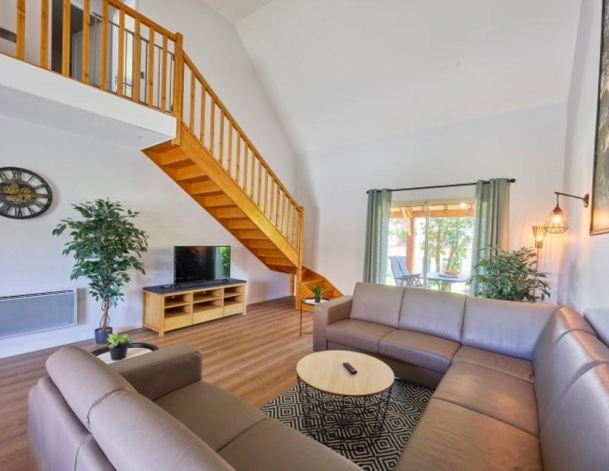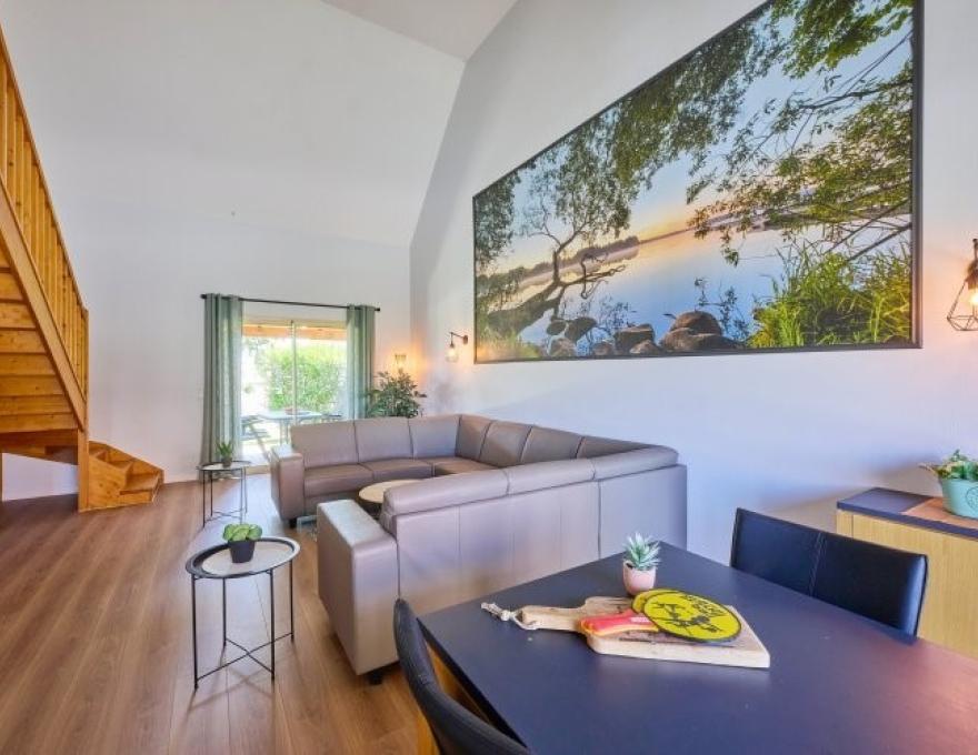 Deze mooi ingerichte 6 persoons villa (115m²) heeft een mezzanine etage waardoor de villa nog groter lijkt dan hij al is. Op de begane grond is de ruime masterbedroom met een en-suite badkamer. Op de eerste etage zijn twee slaapkamers en een badkamer met ligbad en douche. In iedere slaapkamer staan twee boxspringbedden. De keuken is uitgerust met apparatuur zoals een vaatwasser, magnetron, oven, kookplaat en koffiezetapparaat en een wasmachine/droger. In de comfortabele woonkamer staat een comfortabele zithoek met Canal Digital TV waardoor u gegarandeerd geniet van een gezellige avond samen.